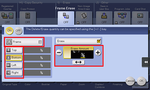 Tap [Frame Erase] in [Application] of copy mode of classic style. To erase all of the four sides of the original by the same width, set [Frame] to ON, and specify the width to be erased. To specify the width of the frame to be erased individually, set [Frame] to OFF, select a target side, then specify the width to be erased. When specifying the erase width individually, you can set to exclude a side from erasing by selecting the side and canceling the setting of [Erase] for that side.