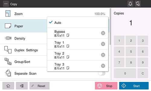 Select [Paper] on the Copy screen, and select the tray loaded with the paper you want to enlarge or reduce.