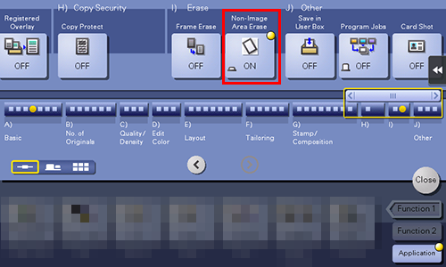 Tap [Non-Image Area Erase] in [Application] of copy mode of classic style, and set to [ON]. The original size of 10 mm e 10 mm (3/8 inches e 3/8 inches) or more can be detected automatically. If the detection fails, a blank sheet of paper is output.