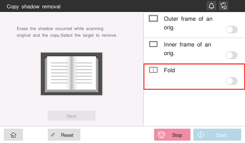 If you are using classic style, tap [Book Original] in [Application] of copy mode, and select [Book Spread]. Set [Center Erase] to [ON], and enter the width of the fold lines to be erased.