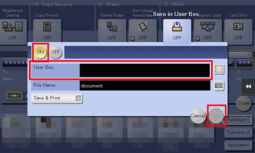 Tap [Save in User Box] in [Application] of copy mode of classic style, and select the User Box for saving in [User Box]. To rename data to save in a User Box, rename it using [File Name]. To save data in a User Box and print the data at the same time, select the [Save & Print] check box.