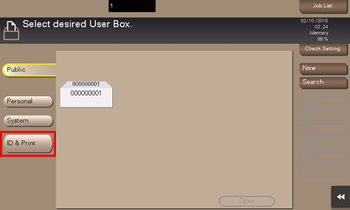 To set a shortcut key of User Box mode, select [Utility] - [Utility] - [Customize] - [User Box Setting] and set [Shortcut Key 1] or [Shortcut Key 2]. Then, select the setting to be displayed as a shortcut key.