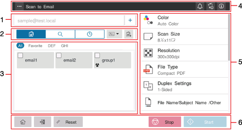 If you tap [Scan to E-mail] on the home screen, the main screen of Scan To E-mail is displayed.