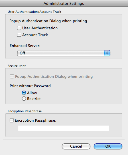 [Administrator Settings] | Select this option to display the window for changing the display settings of the User Authentication Settings window and changing the encryption passphrase. This function is not available when the sandbox-compatible application is used in Mac OS X 10.9. |