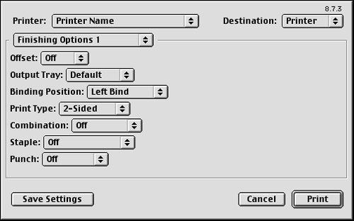 In [Finishing Options] in the [Print] window, you can configure the printer-specific functions. These options can be specified when functions of the machine such as stapling and punching are to be used.