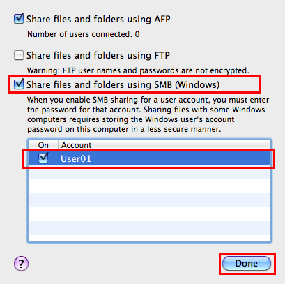 Click [Options], and select the [Share files and folders using SMB (Windows)]. Then, select the log-in user name (displayed name) check box.