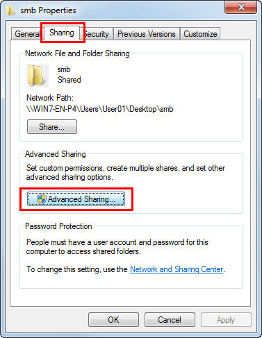 Click the [Sharing] tab, and also click [Advanced Sharing].