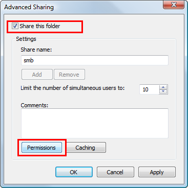 Select the [Share this folder] check box, then click [Permissions].