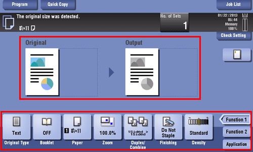 • To configure various copy settings smoothly, you can collectively display the basic copy settings in a single screen, and arrange frequently-used keys in the main screen. For details, refer to Here.