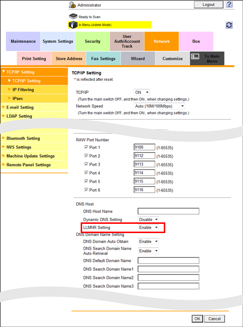 In the administrator mode, select [Network] - [TCP/IP Setting] - [TCP/IP Setting], and set [LLMNR Setting] to [Enable]. You can use this function with the default settings unless otherwise requested.