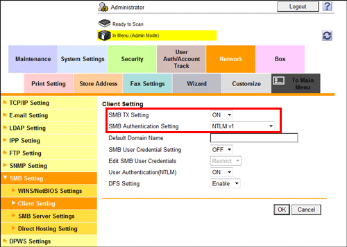 Enable the SMB Send function. In addition, select the authentication method for SMB transmission.