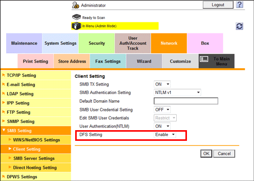 In the administrator mode, select [Network] - [SMB Setting] - [Client Setting], and set [DFS Setting] to [Enable]. You can use this function with the default settings unless otherwise requested.