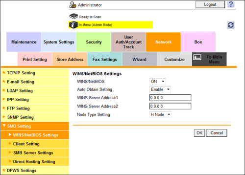 In the administrator mode, select [Network] - [SMB Setting] - [WINS/NetBIOS Settings], then configure the following settings.