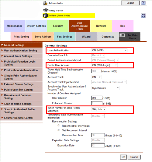 In the administrator mode, select [User Auth/Account Track] - [General Settings], then configure the following settings.