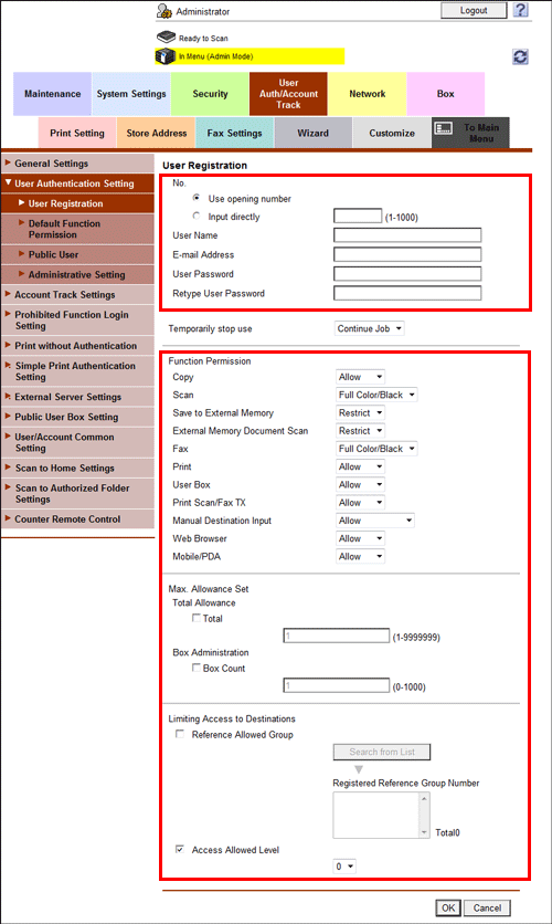 [Max. Allowance Set] | Sets the maximum number of sheets the user can print and User Boxes they can register. For details, refer to Here. |