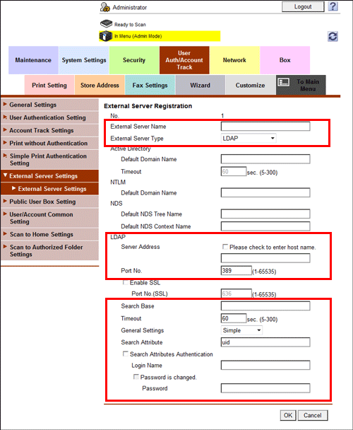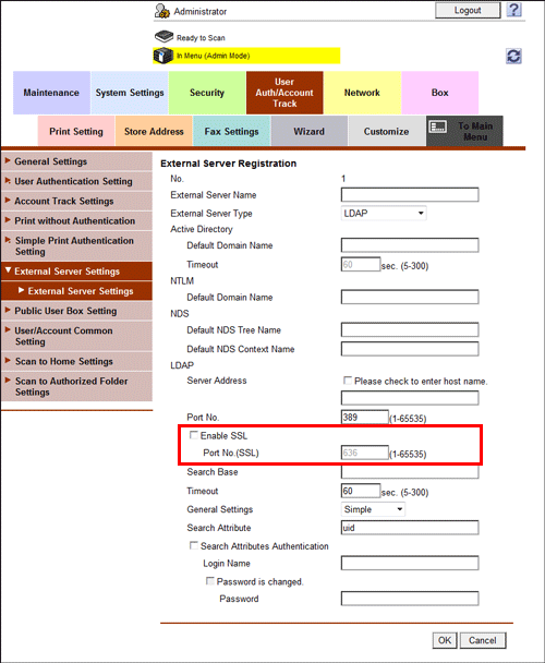 In the administrator mode, select [User Auth/Account Track] - [External Server Settings] - [Edit], then configure the following settings.