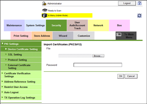 In the administrator mode, select [Security] - [PKI Settings] - [Device Certificate Setting] - [New Registration] - [Import Certificate], then click [Browse] to specify the certificated to be imported.