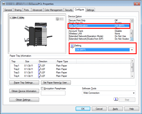 From [Device Option] on the [Configure] tab, select [User Authentication] or [Account Track] and select the target option from [Setting].
