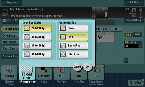 [Scan Resolution] | Select the resolution of the original for scan transmission. When using Scan to E-mail, SMB Send, FTP Send, WebDAV Send, or Save in User Box, select the following resolution to scan an original.