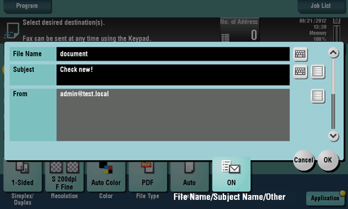 [From] | If necessary, change the sender E-mail address. In normal circumstances, the E-mail address of the administrator is used as sender E-mail address. If user authentication is installed on this machine, the E-mail address of the login user is used as sender E-mail address. |