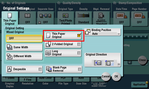 This function reduces the transport speed of the original on the ADF to prevent the original from being caught when scanning an original that is thinner than plain paper.