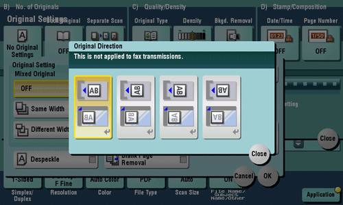 Even for an original with pages of different sizes, by using the ADF, you can scan data while detecting the size of each page. If the widths of the originals are the same, select [Same Width]. If the widths of the originals are different, select [Different Width].