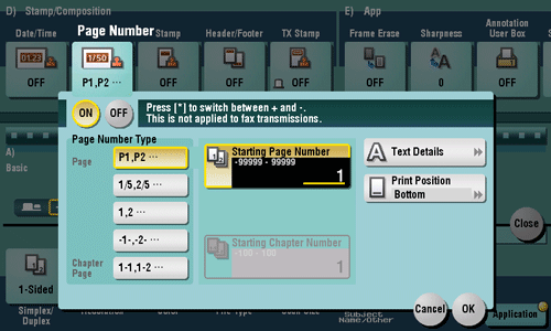 [Starting Page Number] | Enter the starting page number to be printed on the first page using the Keypad. To display the Keypad, tap the input area for the numeral. For example, to print page numbers from the third page of the original, enter "-1". The first page of the original is counted as "-1", and the second page as "0", and the third page is counted as "1". In [Starting Page Number], a page number is printed on pages 1 and later. If "2" is entered, page numbers are printed from the first page of the original as "2, 3", etc. in order. The "-" (minus sign) changes to + each time you tap [*]. |