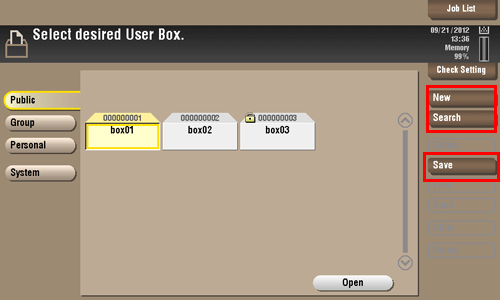 Tap [Utility] - [One-Touch/User Box Registration] - [Create User Box] - [Public/Personal User Box] - [New].