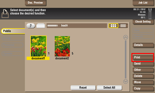 This example uses the Public User Box for explanatory purposes. To use a Personal User Box or a Group User Box, tap [Personal] or [Group] and select the desired box.