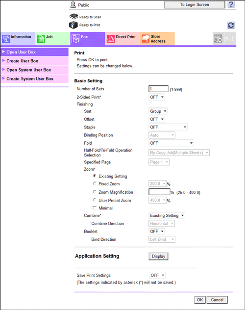 [Application Setting] | Configure more detailed setting such as Stamp or Send & Print. When using this function, click [Display]. |