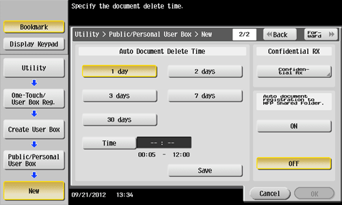 If files stored in a User Box are not used, they are deleted automatically when the [Auto Document Delete Time] has passed (Default: [1 day]).