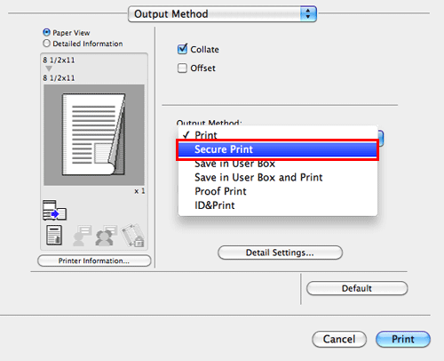 In [Output Method:] in the [Output Method] window, select [Secure Print].
