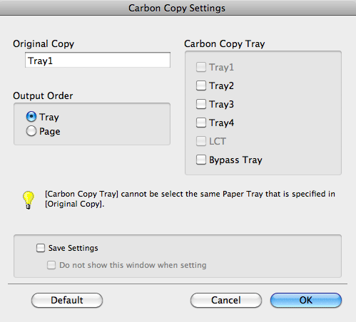 [Save Settings] | When the Save Setting check box is selected, the settings are saved. When the [Do not show this window when setting] check box is selected, this dialog box is not displayed when [Carbon Copy] is enabled. Using this function, you can save steps to configure settings the next time and after if you always specify the same carbon copy tray settings to execute a print job. |