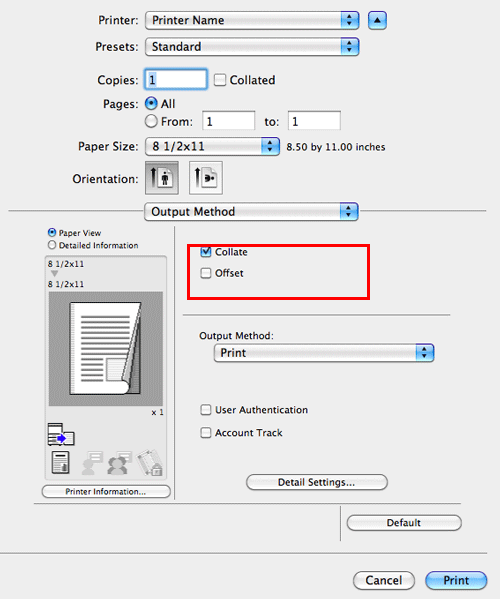 When the [Collate] check box in [Output Method] is selected, copies are output in a set-by-set manner, for example, "Pages 1, 2, 3, 4, and 5", "Pages 1, 2, 3, 4, and 5", and then "Pages 1, 2, 3, 4, and 5". When the [Offset] check box is selected, the sets are output in staggered layers.