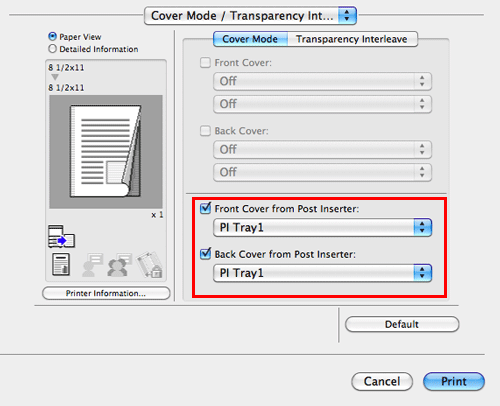 In [Cover Mode / Transparency Interleave] or [Cover Mode] (Mac OS X 10.7 or later), select the [Front Cover from Post Inserter:] and [Back Cover from Post Inserter:] check boxes.