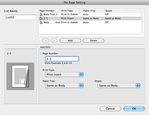 Create in advance a list that specifies the paper and print settings for each page. When printing on inserted paper, select the list you want to apply to printing.