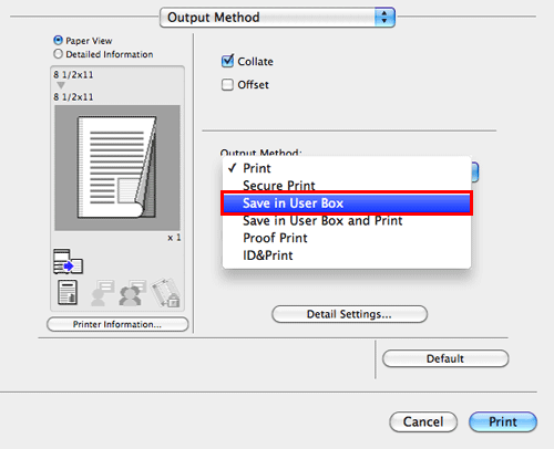 In [Output Method:] in the [Output Method] window, select [Save in User Box].