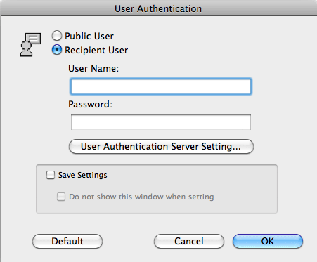 When user authentication is enabled, select [Recipient User], enter the user name and password, then click [OK].