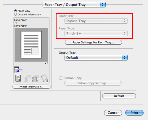 In [Paper Type:] in [Paper Tray / Output Tray], select the type of paper for printing. This function is enabled when [Paper Tray:] is set to [Auto].