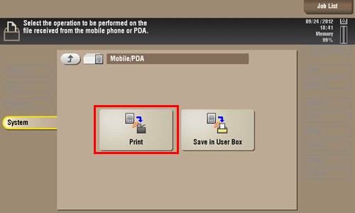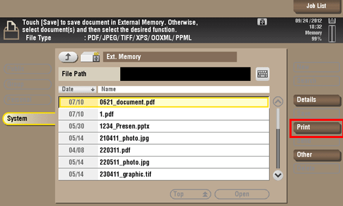 You can also print files by selecting the User Box operation mode and by tapping [System] - [External Memory].