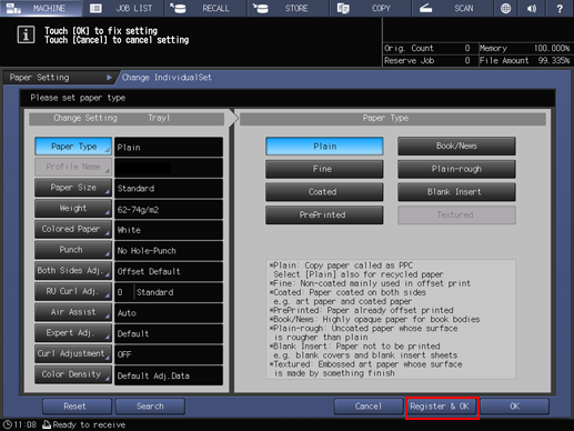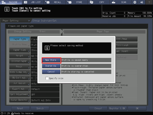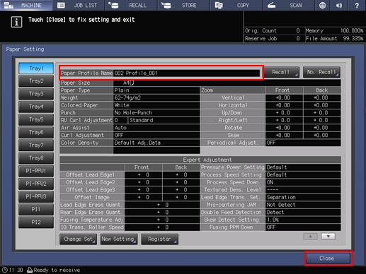 If an adjustment is made for paper of a new brand, weight, or size, its contents will be newly registered as a paper profile.