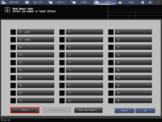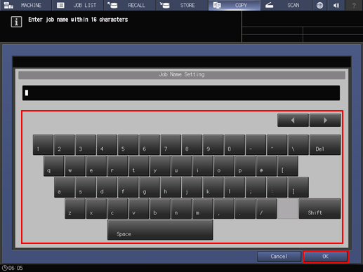 • supplementary explanationMake sure that you enter a name for the job. You cannot return to the Mode Memory Mode screen even when pressing OK without entering a name for the job.