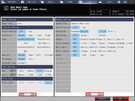 • supplementary explanationIf any setting change is desired, press Cancel on the screen to check the details and then press Cancel on the Mode Memory Mode screen. The screen returns to the COPY screen. Make correction of the settings.