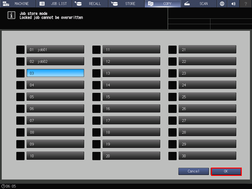 • supplementary explanationTo return to the Mode Memory Mode screen, press OK. Check that the job name has been correctly entered.