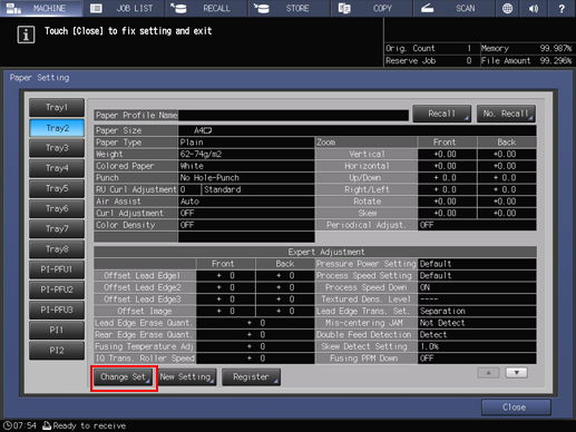 • supplementary explanationThe Change IndividualSet screen provides the following settings: Paper Type, Paper Size, Weight, Colored Paper, Punch, Both Sides Adj., RU Curl Adj., Air Assist, Expert Adj., Curl Adjustment, and Color Density. Some items are not displayed depending on the tray to be used or conditions.