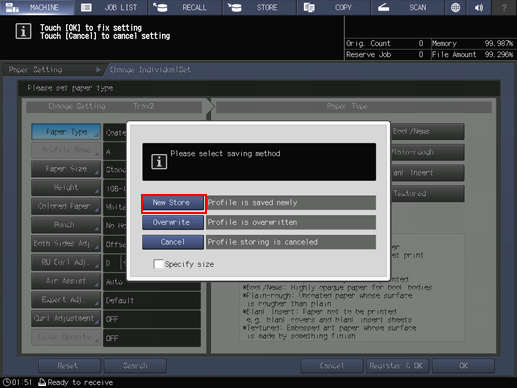 • supplementary explanationSelecting Overwrite overwrites the registered paper conditions.