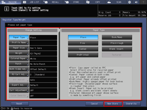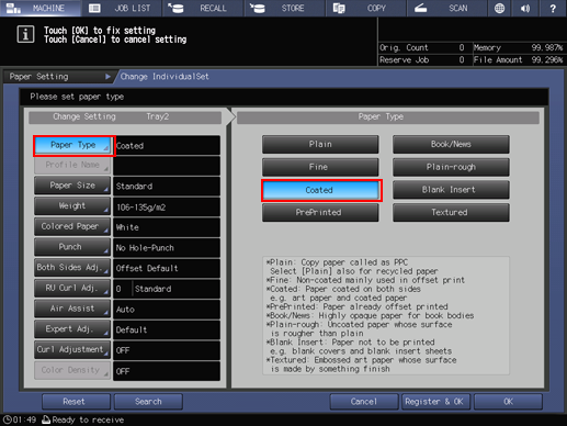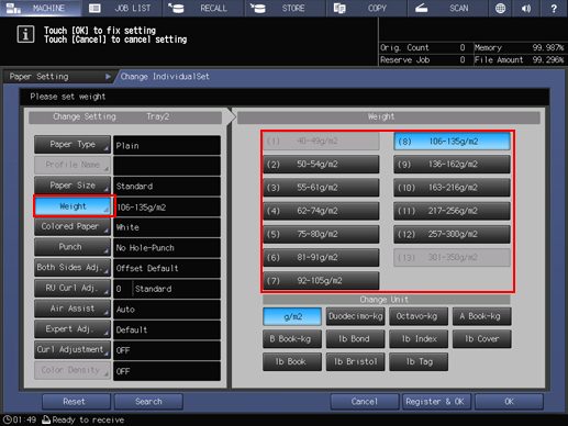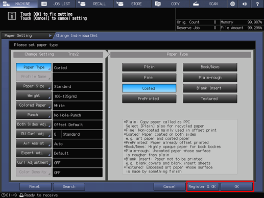 6. Check the settings, and press Register & OK; paper conditions are registered.