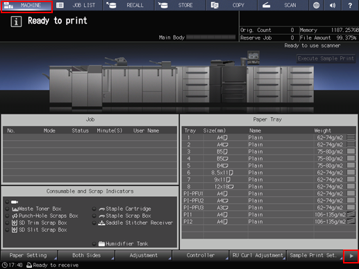 1. On the touch panel of the main body, press right in the lower-right of the MACHINE screen.
