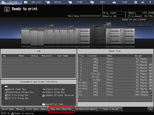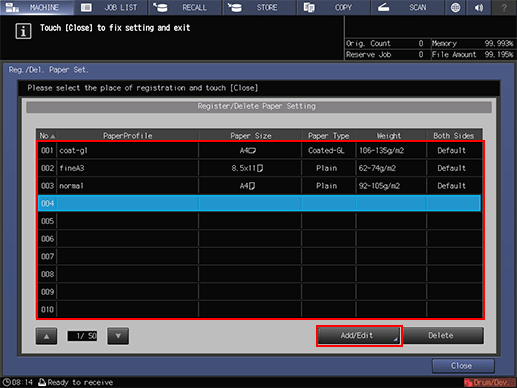 • supplementary explanationThe paper profile registered can be edited or deleted on the Reg./Del. Paper Set. screen.