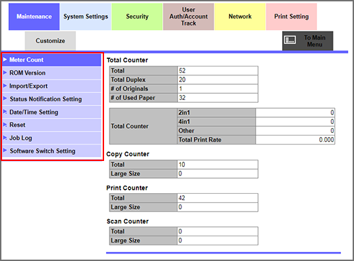 The Maintenance tab provides the information and settings concerning the maintenance of the machine.